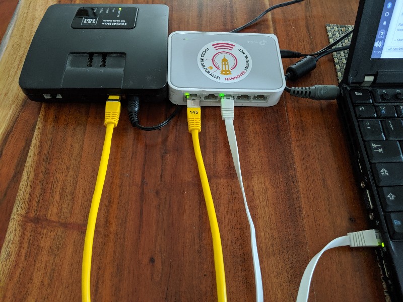 Sollte euer Computer bei dem FTP Versuch keine Verbindung über die 192.168.178.1 zur Fritz Box bekommen kann es sein, dass der Netzwerk Port eures Computers zu langsam schaltet. In diesem Fall einfach einen Netzwerk Switch zwischen Computer und Fritz Box hängen (ich mache das generell so - das sieht dann so aus).