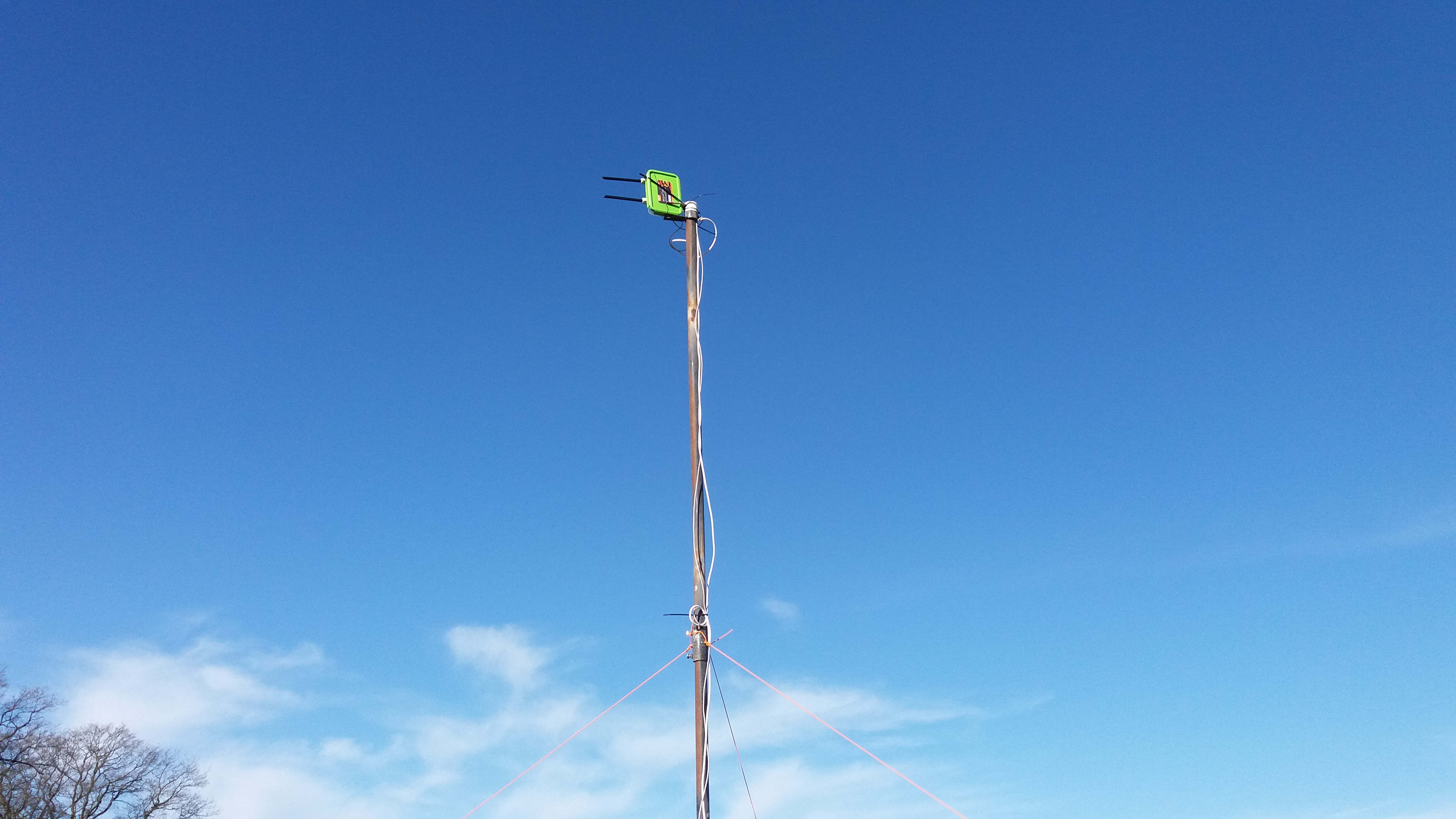 Die gesamte Hardware wird in unterschiedlichen Höhen an einem etwa sechs Meter langen verzinkten Metallrohr befestigt, das oben mit einer Plastikkappe einer alten Farbdose abgedichtet wird.