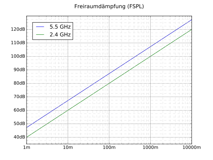 Um die Distanz der Richtfunkstrecke mit ins Spiel zu bringen betrachtet man die Freiraumdämpfung (FSPL). Sie ist abhängig von der Frequenz (bzw. damit einhergehend der Wellenlänge) der sich ausbreitenden Welle. Hier sieht man wie sich die Freiraumdämpfung bis zu einem Abstand von 10km bei ausgewählten WLAN - Frequenzen verhält: